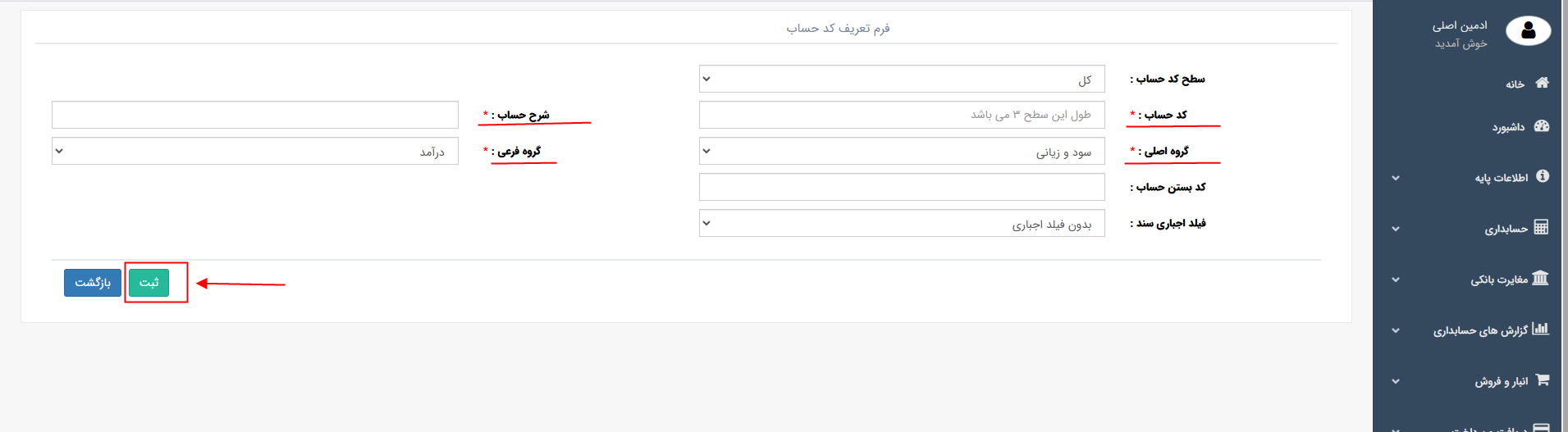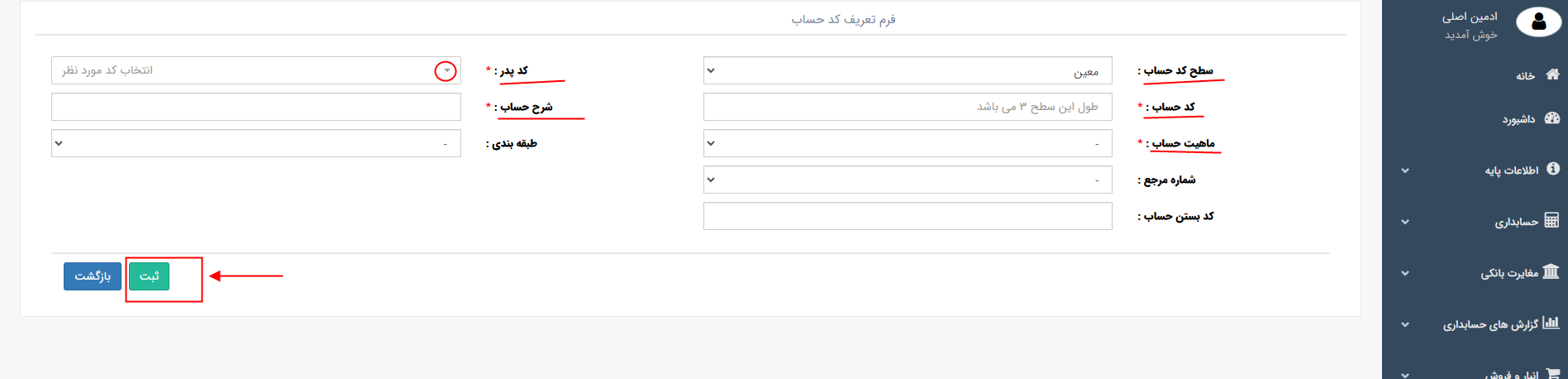 • کد حساب  را  وارد کنید (توجه کنید که کدهای تکراری نباید وارد کنید)