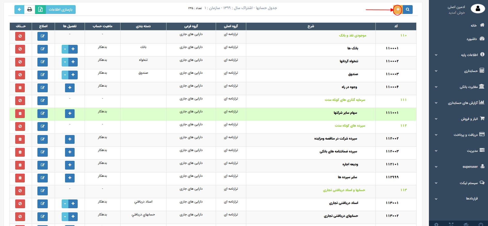 1- برای رویت کد حسابداری و انجام عملیات روی آن در قسمت منو (منوی سمت راست) روی حسابداری و زیر منوی جدول حسابها کلیک کنید، جدول حسابها نمایش داده می‌شود