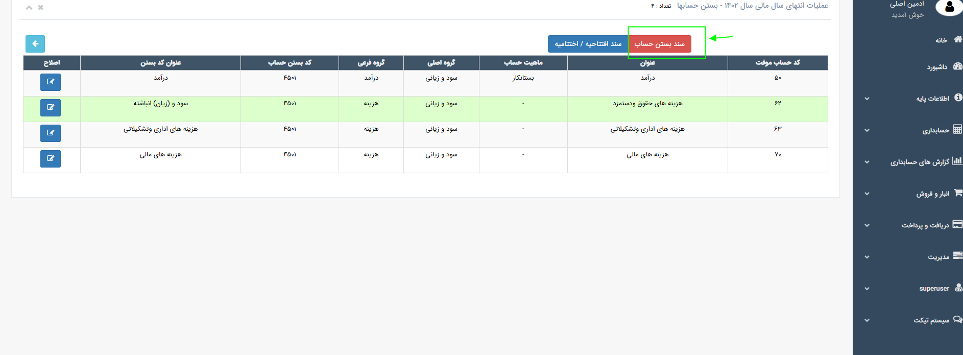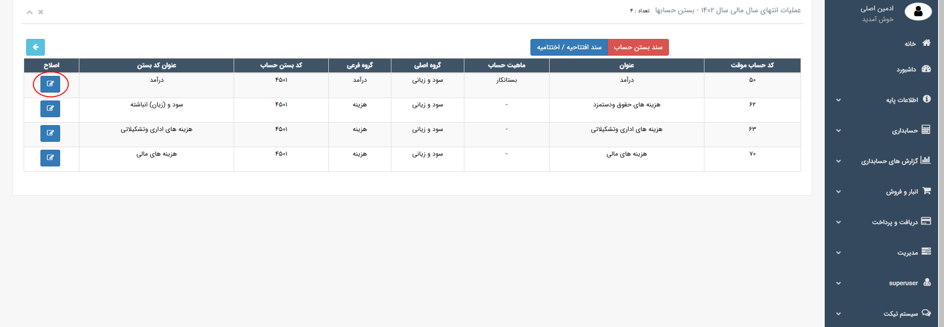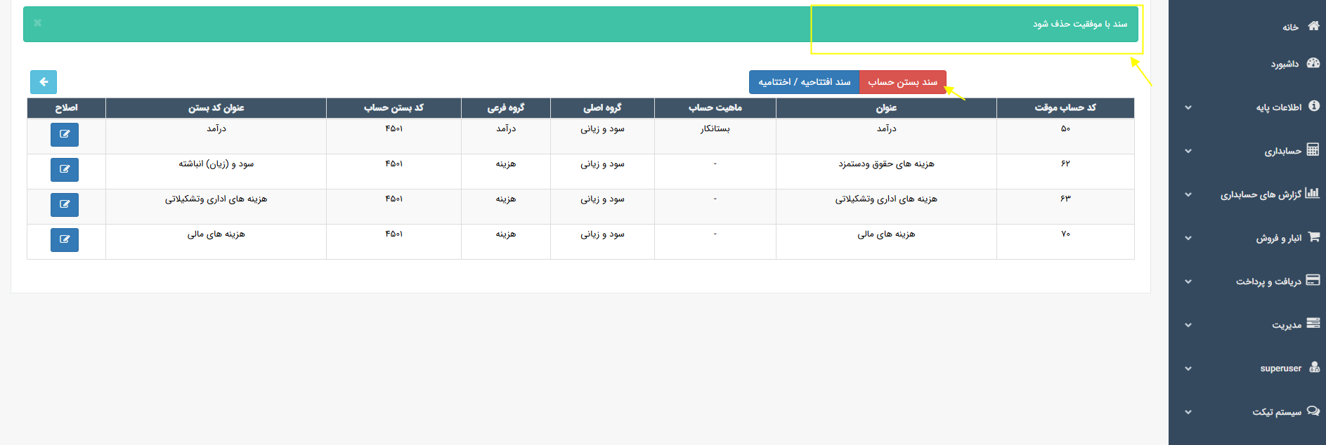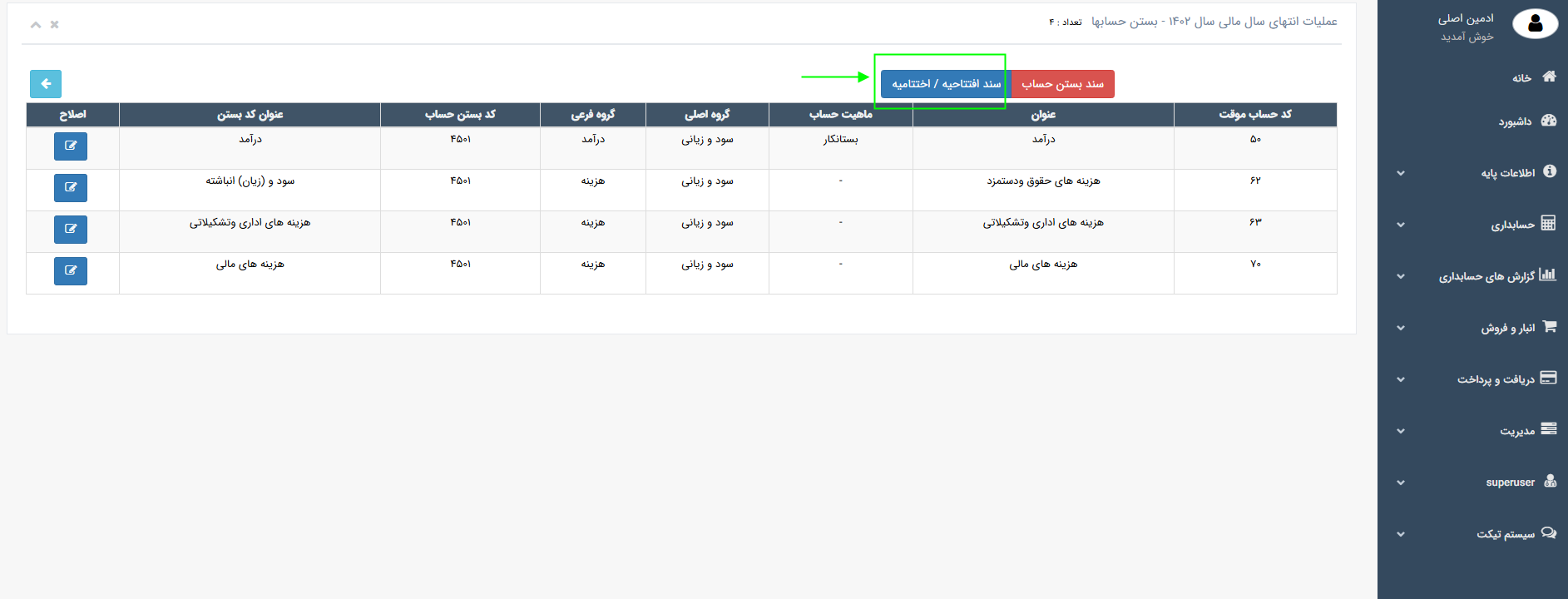 ♦♦♦ برای تایید سند، اصلاح و یا حذف سند، وارد منو حسابداری ← فهرست اسناد شوید.سند اختتامیه را یافته و تغییرات لازم را اعمال نمایید.