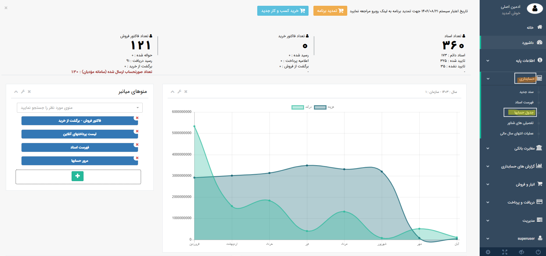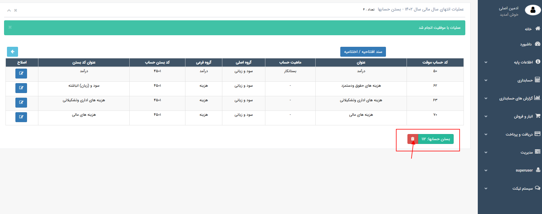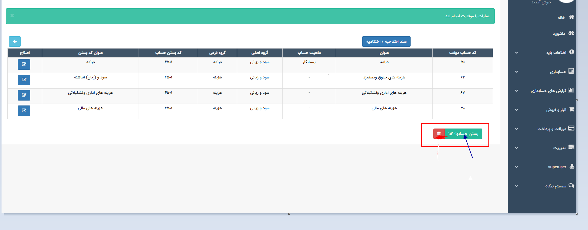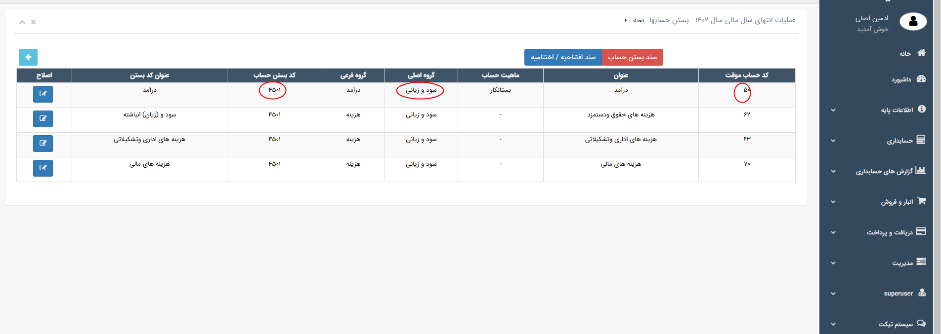 ♦♦♦ برای تایید سند، اصلاح و یا حذف سند، وارد منو حسابداری ← فهرست اسناد شوید.سند اختتامیه را یافته و تغییرات لازم را اعمال نمایید.