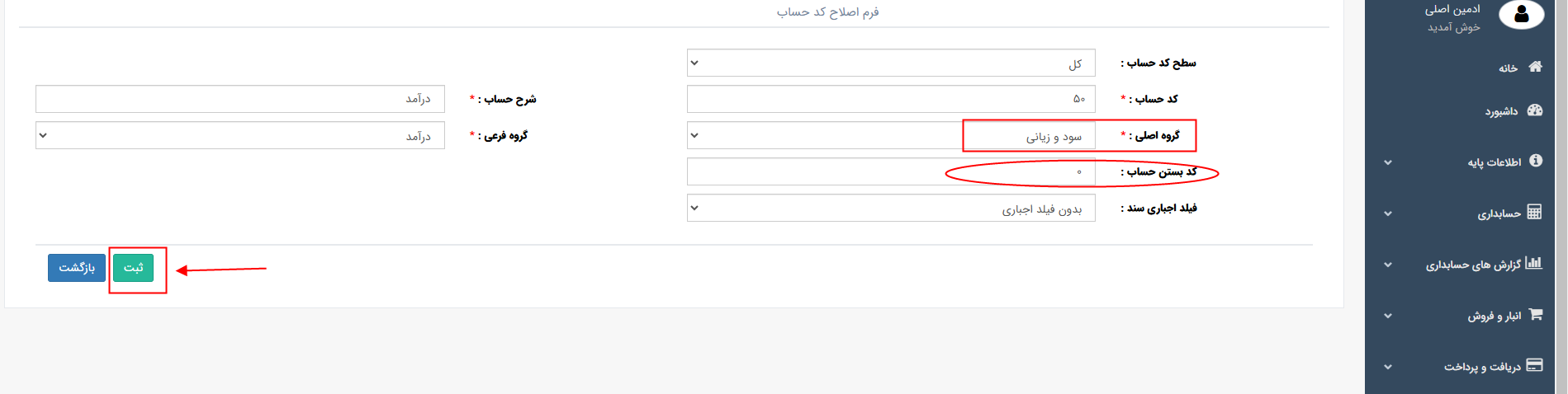 4- طبقه بندی کد را روی (سود و زیان) قرار دهید و گزینه ثبت را بزنید.
