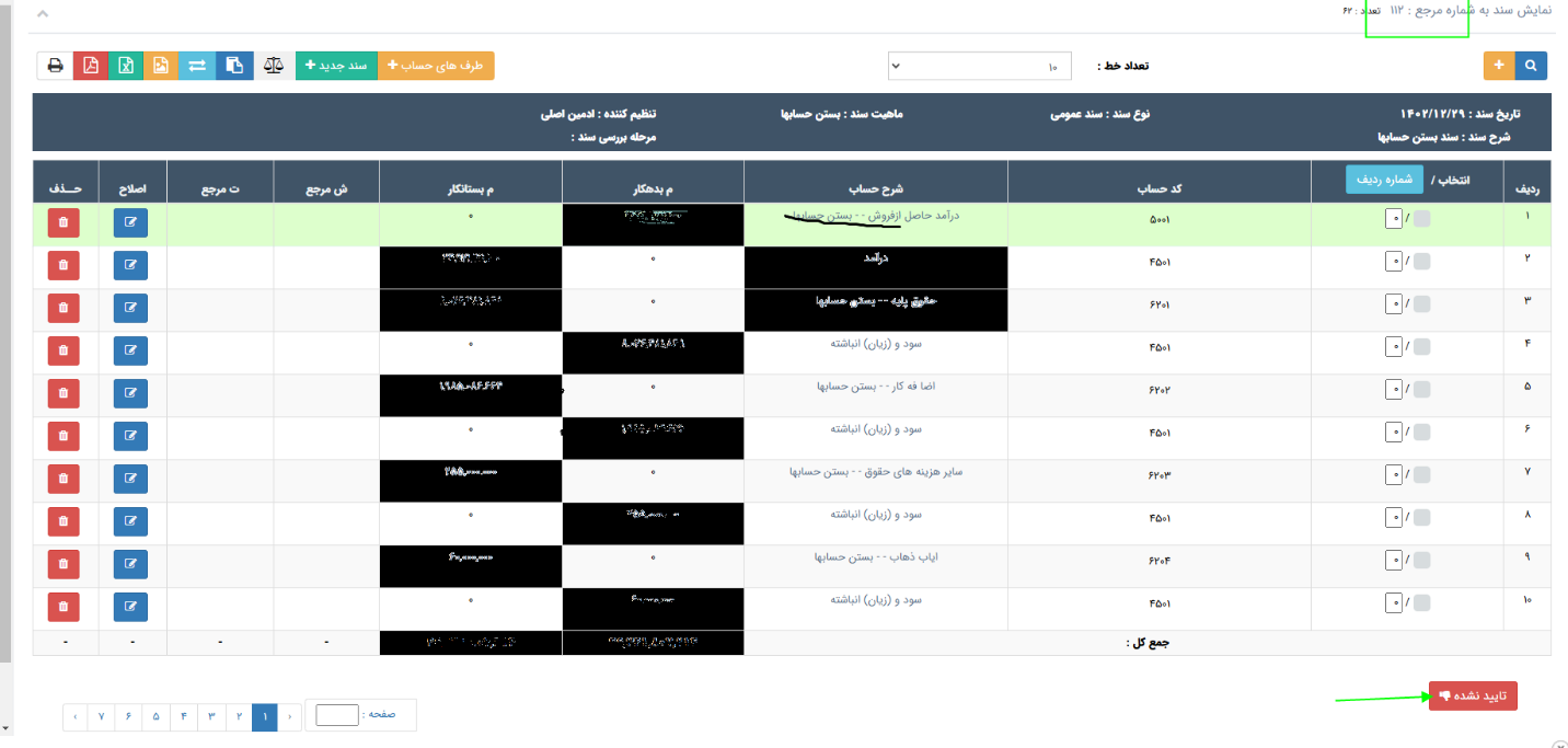 14 – اگر روی بستن حسابها کادر سبز پایین صفحه کلیک کنید، سند (تایید نشده) باز میشود. توجه کنید عددی که کنار بستن حسابها نوشته شده نشان دهنده شماره مرجع سند بستن حسابهای شماست (در تصویر زیر، شماره مرجع 112 است)