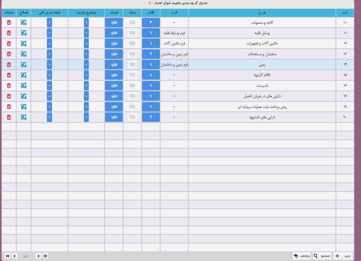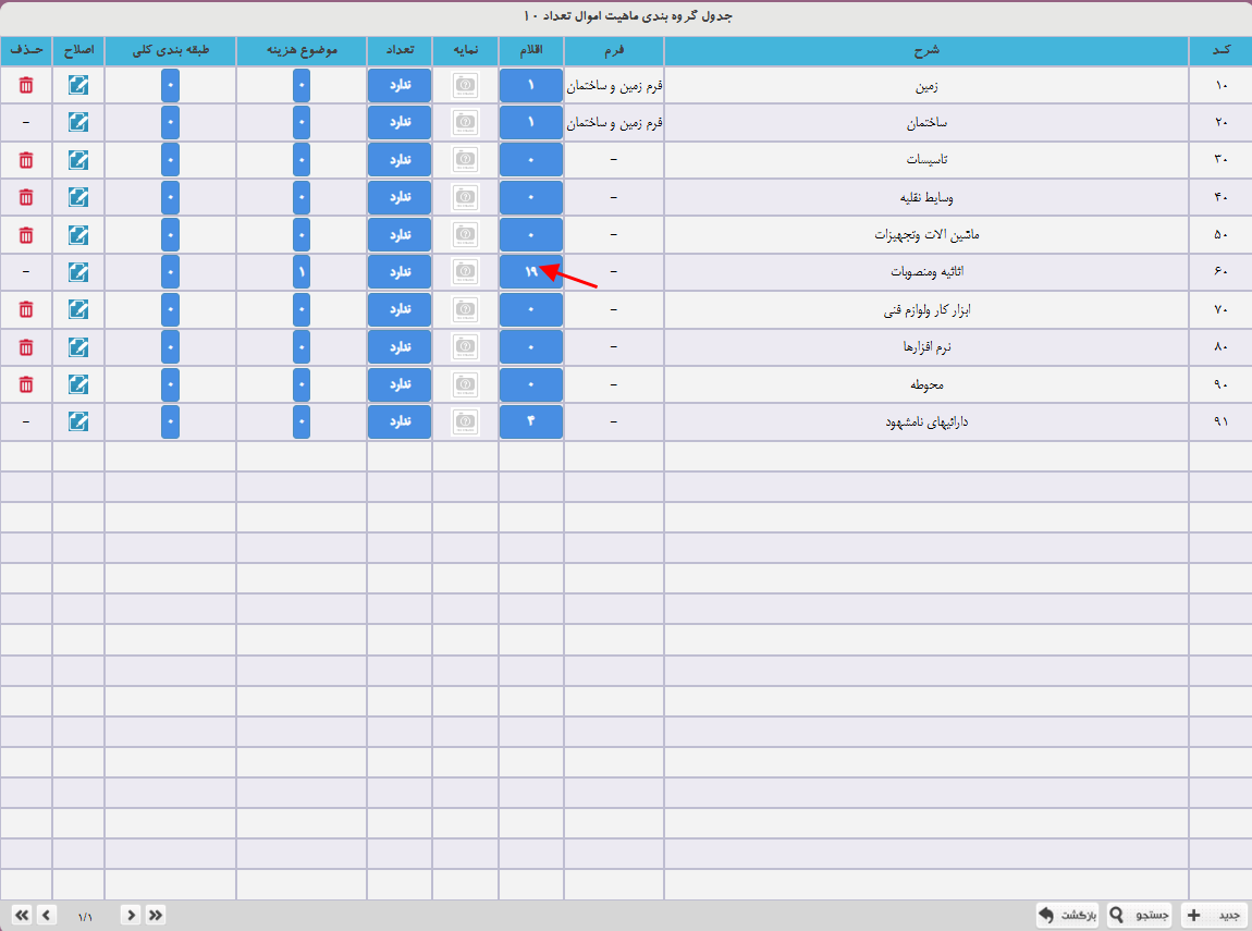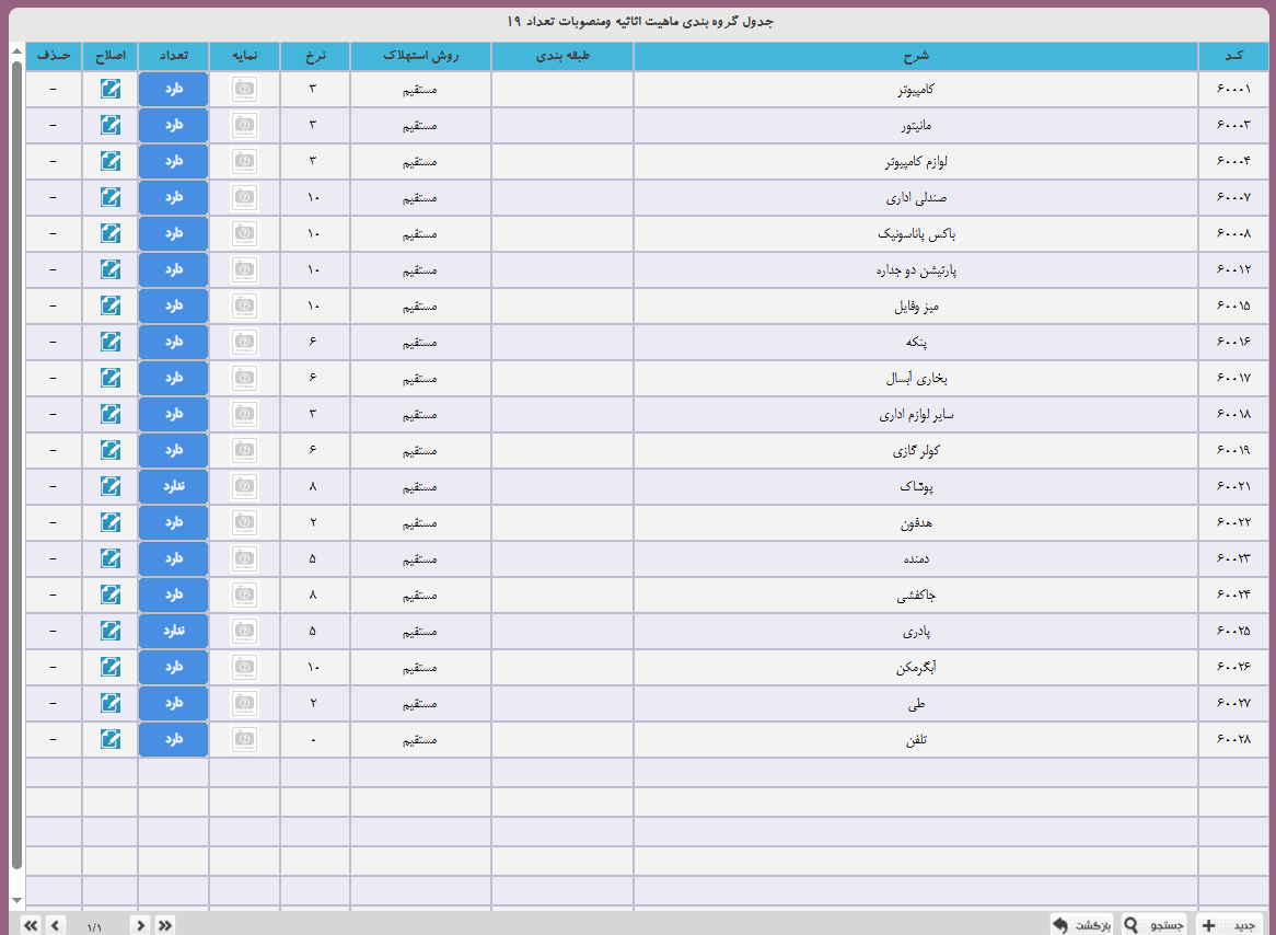 در منو جداول پایه>طبقه بندی انواع دارایی ها  وارد شوید